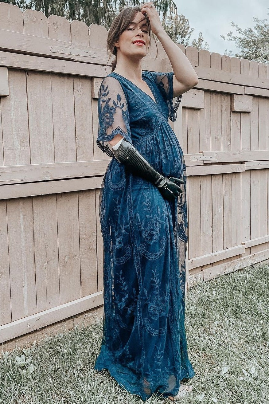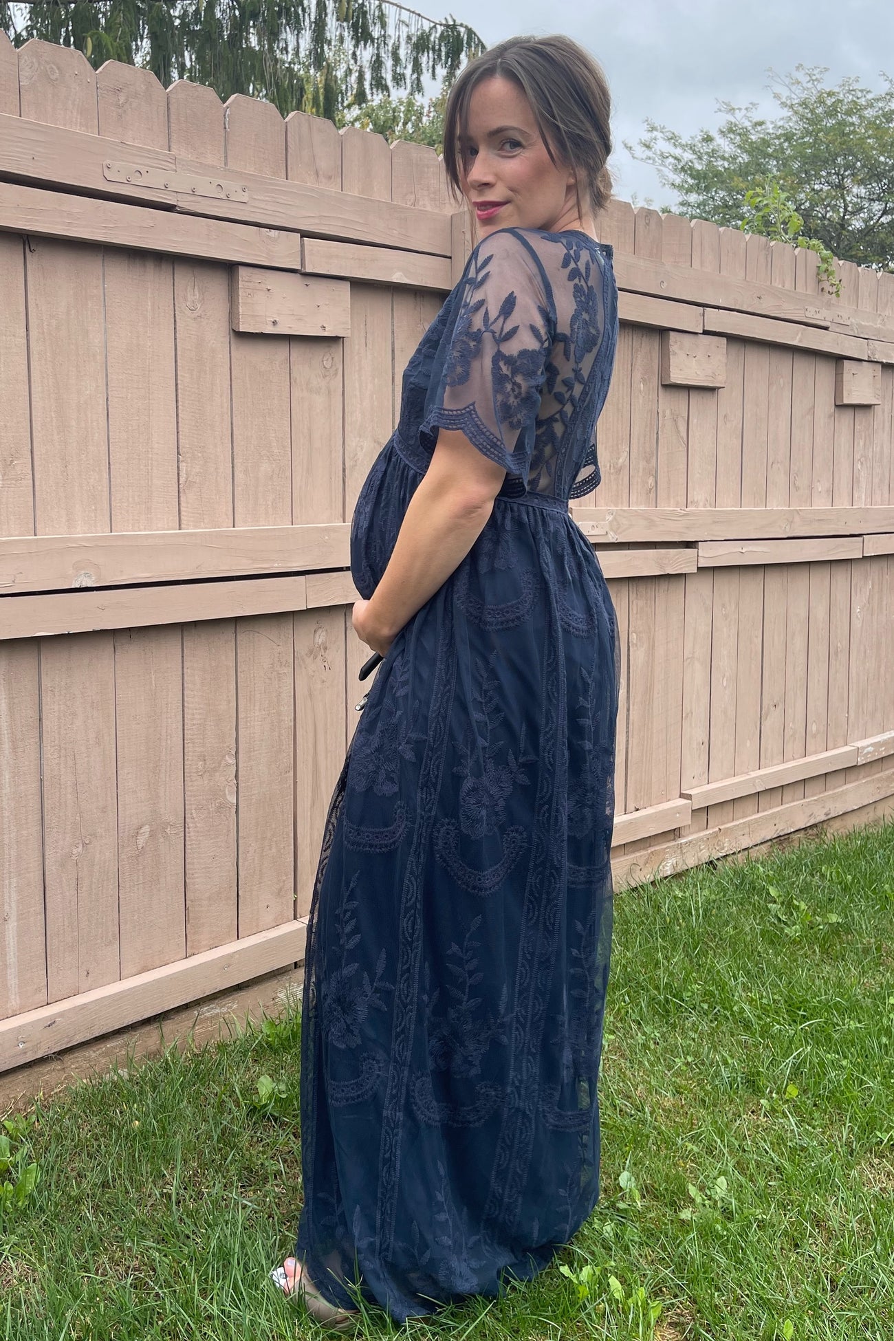 PinkBlush Navy Blue Lace Mesh Overlay Maternity Maxi Dress