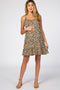 A leopard print sleeveless mini dress featuring adjustable cami straps and a ruffle hem.