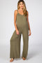A solid hued, sleeveless maternity jumpsuit featuring adjustable cami straps, a crisscross back detail, wide leg pants, and a v-neckline.