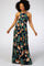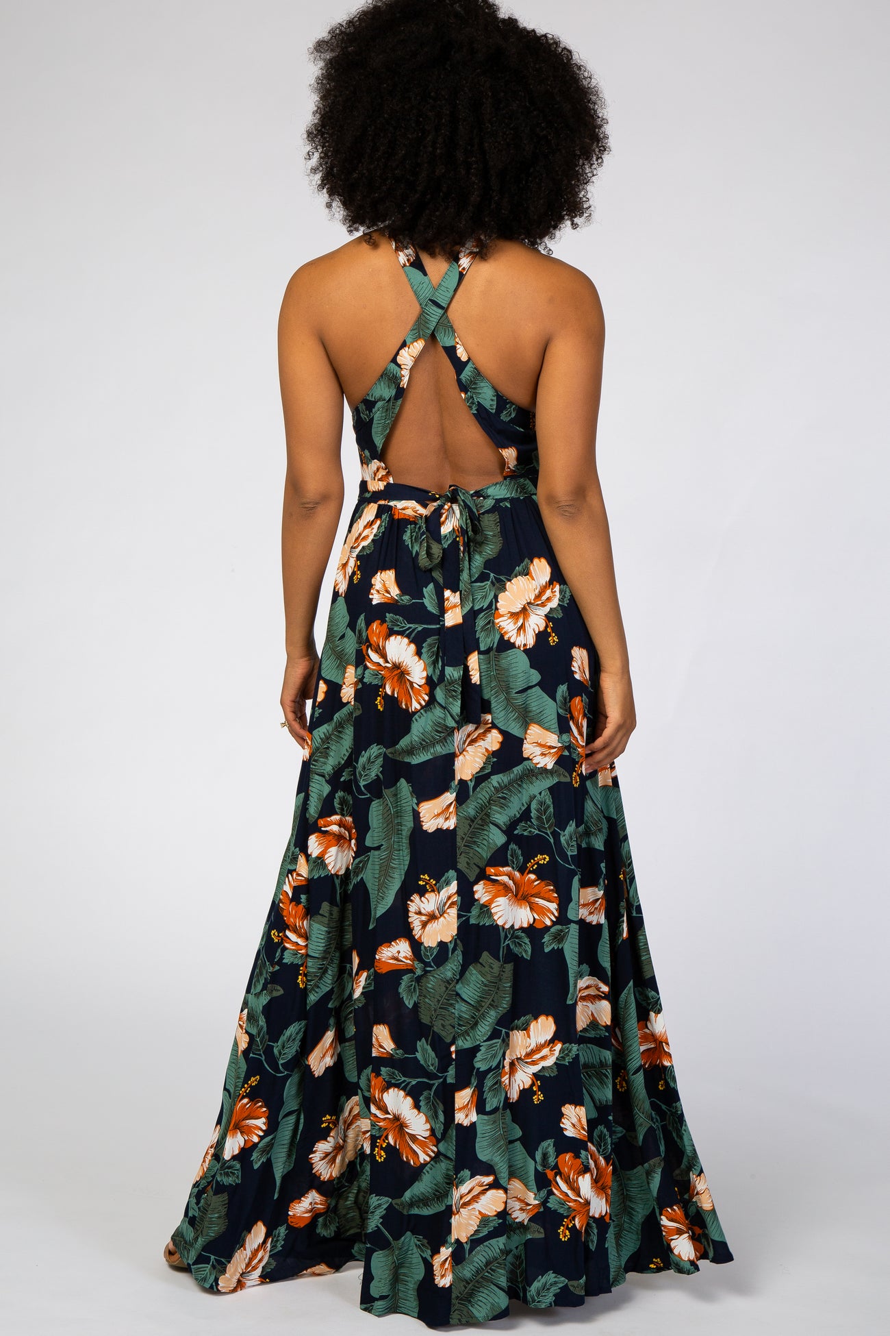 A palm print maxi dress featuring a halter neckline, a cross back, and adjustable waist tie and a back zipper. This style runs small.