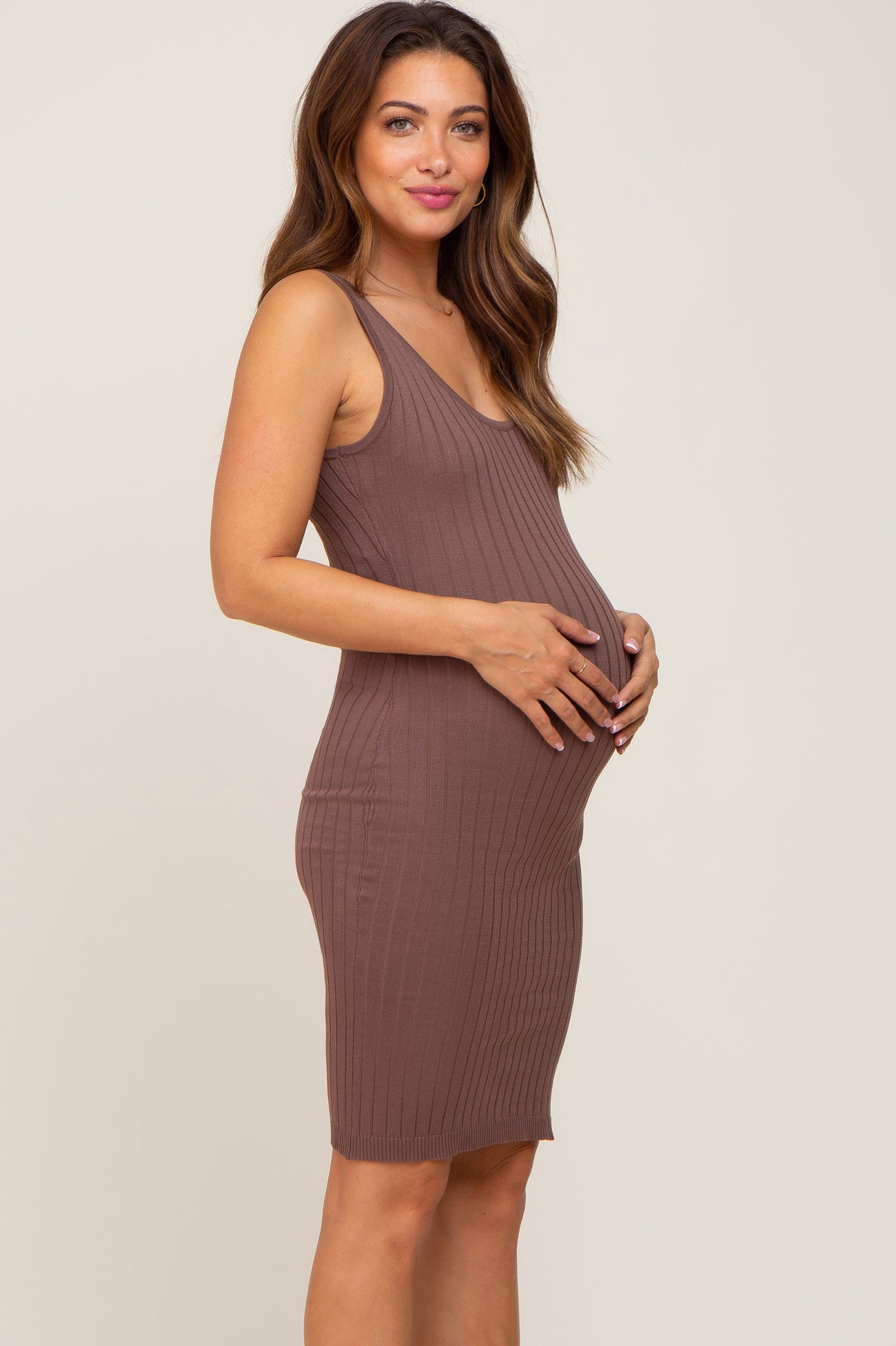 Brown Rib Knit Sleeveless Maternity Dress