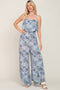 A printed maternity jumpsuit featuring a strapless straight neckline, a ruffle layer, a smocked elastic bust, an empire waist and wide ruffle pant legs.