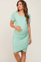A ribbed knit dress featuring a rounded neckline, short sleeves, side ruching, and a wrap hem.