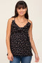 A floral print maternity tank top with a ruffle accent v-neckline, crisscross back, and adjustable straps.