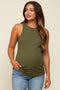 A basic solid tank top in a ribbed material with a higher neckline and rounded hem.
