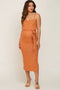 Details A floral, ribbed midi dress with a straight neckline, side slit, and an adjustable back tie. Content + Care
