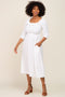 A solid midi dress featuring a swiss dot texture, 3/4 sleeves, a smocked top and a ruffle square neckline.