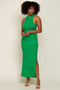 A solid ribbed sleeveless maxi dress featuring side slits and a rounded neckline.