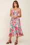 A printed midi with adjustable shoulder ties, a smocked bodice, and a lined skirt.