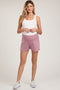 A pair of soft knit maternity lounge shorts featuring a smocked elastic waistband and a lettuce edge hem.