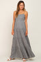 A floral maternity maxi featuring a straight neckline, adjustable straps, a tiered skirt, and a back zipper closure. Dress is partially lined.