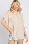 Details A light blue striped top featuring a collared neck, a v-neckline, short sleeves and a rouned hi-low hem. Content + Care
