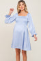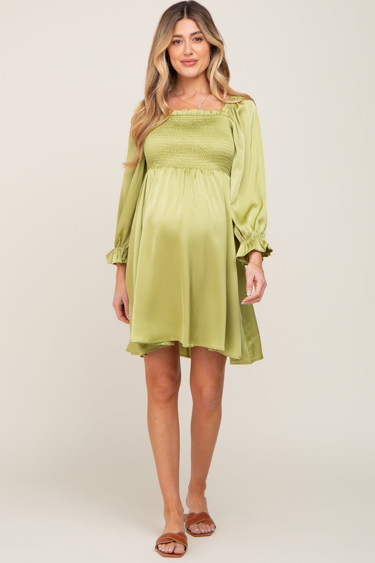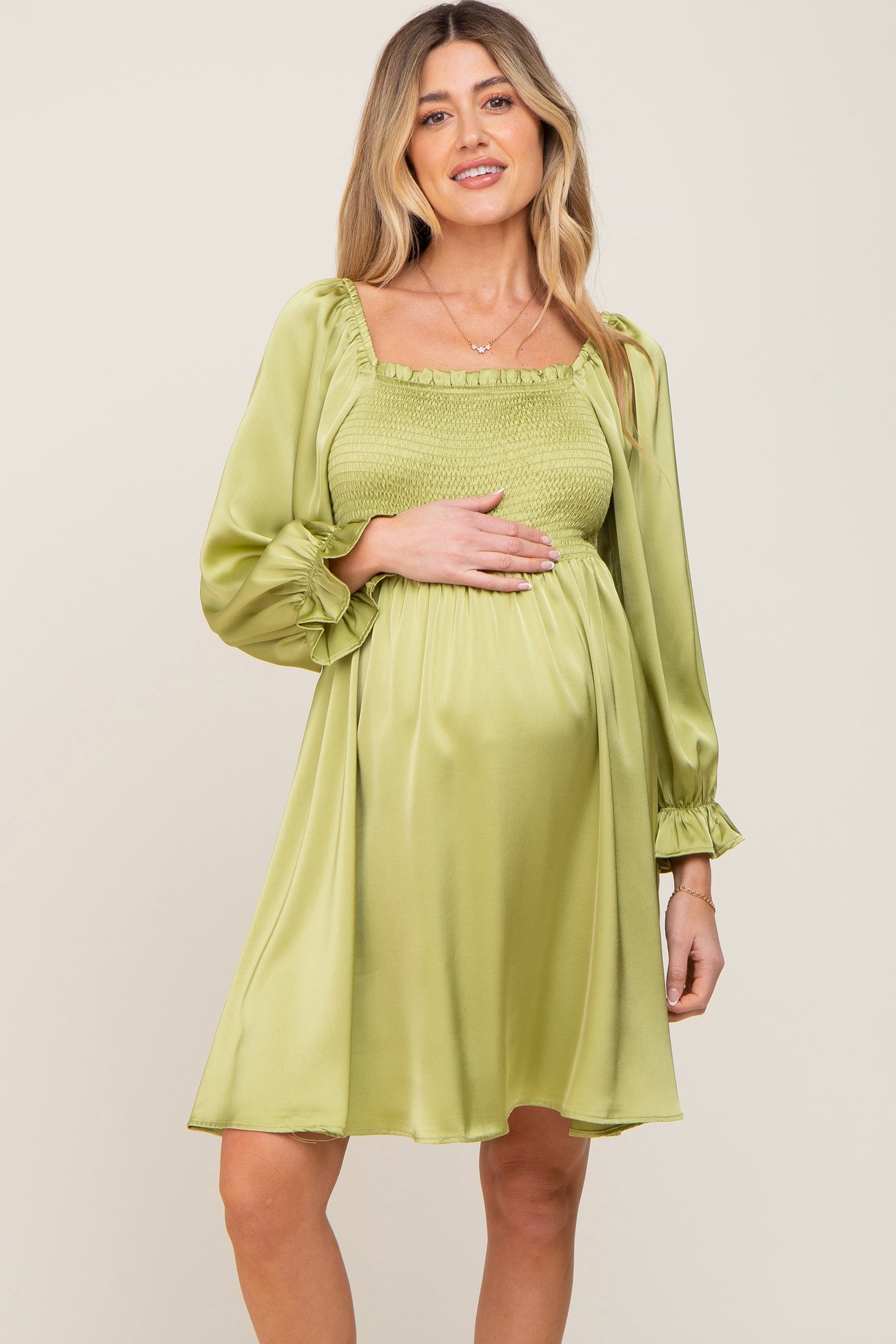 Details A satin maternity dress featuring a square neckline, a smocked elastic top, long sleeves with a ruffle trim and an empire waist. Content + Care