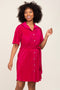 A shiny pleated dress featuring a collared neckline, a button front, a belted adjustable tie at the waist and short sleeves.