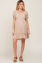 A stripe print dress featuring short puff sleeves, a u-neckline, a back keyhole button closure, a back tie, and a gathered hem. Dress is lined.