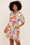 A floral dress that features short puff sleeves, a v-neckline, side pockets, a back keyhole button closure, and a gathered bottom hem.