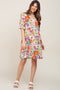 A floral maternity dress that features short puff sleeves, a v-neckline, side pockets, a back keyhole button closure, and a gathered bottom hem.