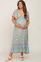 Aqua Floral Print Wrap V-Neck Midi Dress