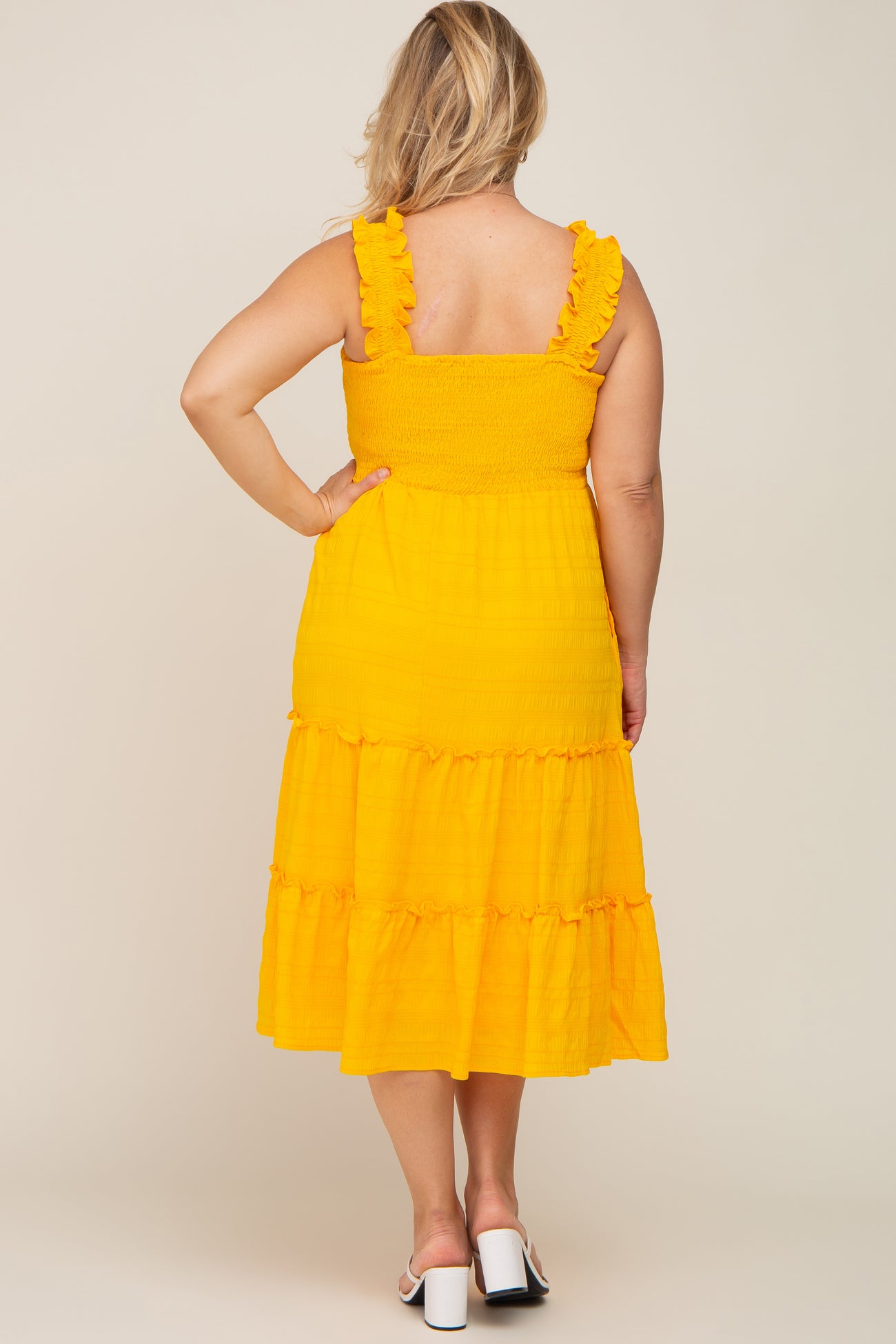 Yellow Smocked Square Neck Ruffle Strap Tiered Maternity Plus Midi Dress