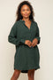 A pinstriped linen dress featuring a collared neckline, a button down front and long sleeves.