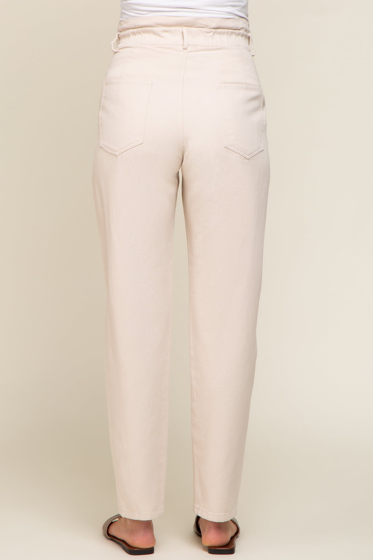 Beige Smocked Waist Straight Leg Maternity Jeans