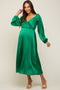 A satin solid hue midi dress with long puff sleeves, smocked accents at the shoulder, a wrap v-neckline with a snap button closure, and an elastic waist.