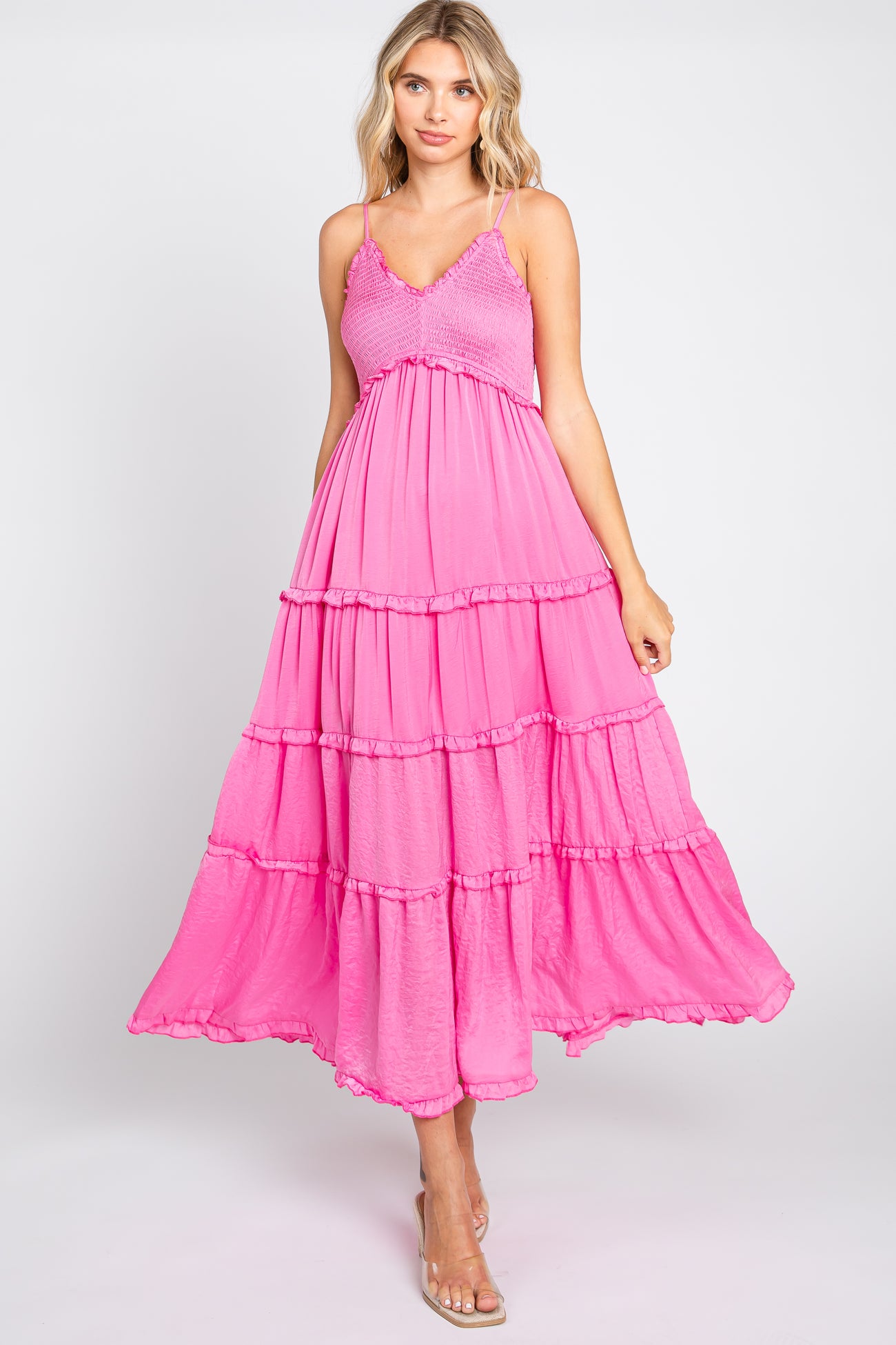 A maxi dress with a ruffle accent v-neckline, adjustable straps, a smocked top, and ruffle accent tiers. Skirt is partially lined.