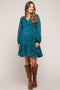 A printed dress with a v-neckline, a smocked bodice, semi sheer long sleeves, and a tiered skirt. The body of the dress is lined 3/4 of the way down.