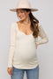 A ribbed fitted maternity top featuring long sleeves, a self-tie back, a sweetheart neckline and a curved hem.