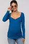 A ribbed fitted maternity top featuring long sleeves, a self-tie back, a sweetheart neckline and a curved hem.