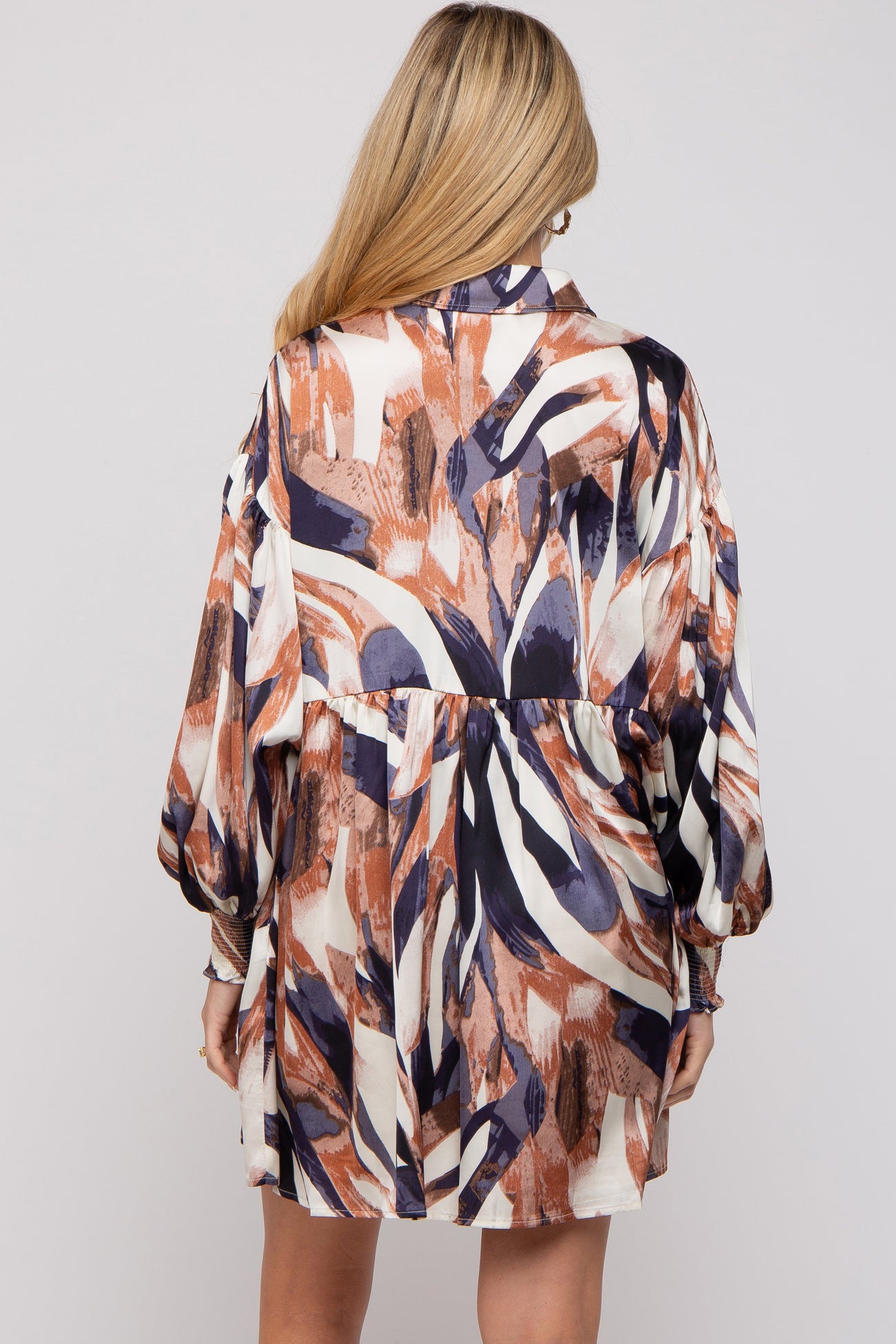 A satin printed maternity dress with a collar, front functioning buttons, side pockets, and long puff sleeves with smocked cuffs.