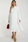 Details A solid maternity midi dress featuring functioning top buttons, a collar, long sleeves, side pockets, and a tiered skirt. Body is fully lined. Content + Care
