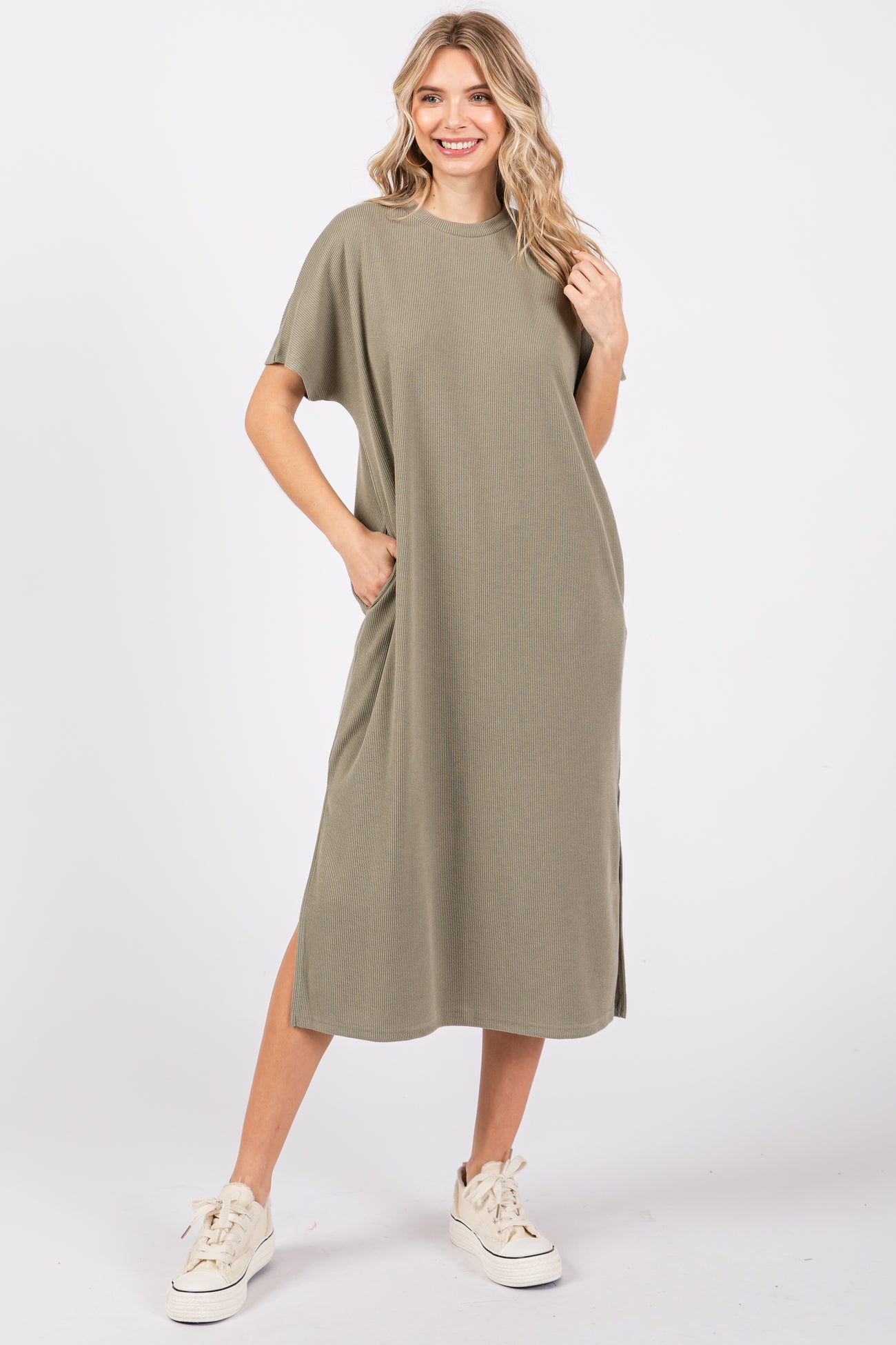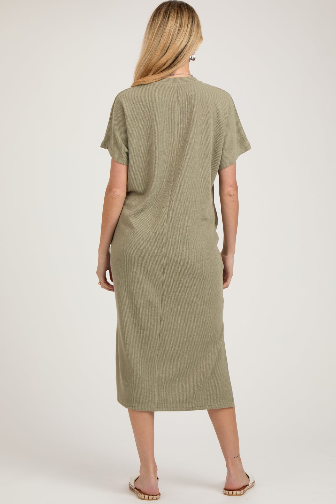 Light Olive Ribbed Short Dolman Sleeve Side Slit Maternity Midi Dress