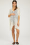 A solid lightweight crochet knit maternity swim cover up featuring two side slits and tassel detail.