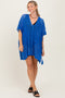 A solid lightweight crochet knit swim cover up featuring two side slits and tassel detail.