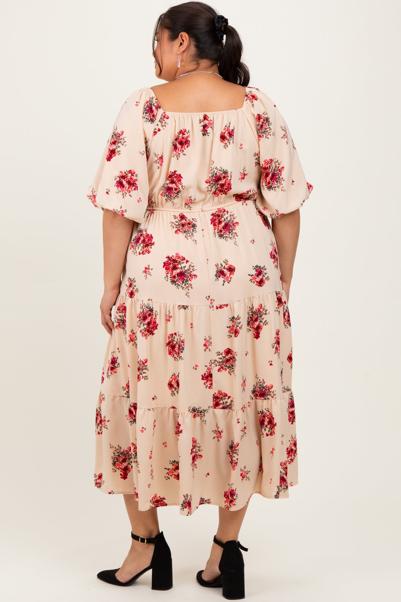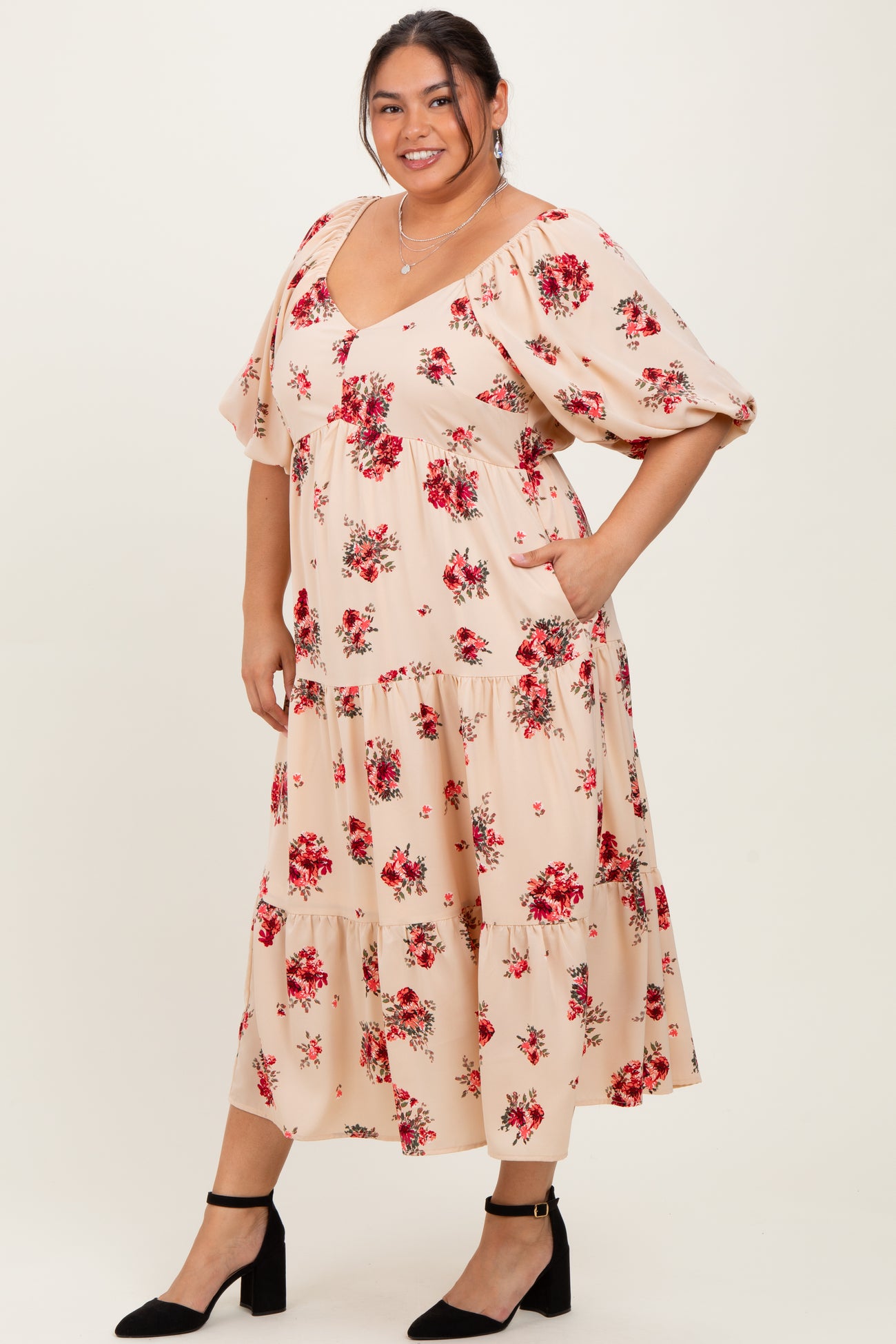 Elevate your wardrobe with this Cream Floral Puff Sleeve Plus Tiered Maxi Dress. Featuring a flattering sweetheart neckline and voluminous puff sleeves, this dress combines comfort with timeless style. The tiered maxi silhouette flows effortlessly, adorned with a charming red floral print on a soft cream background. Perfect for brunch, garden parties, or casual outings, this dress offers a breezy fit for all-day comfort. Pair it with heels or sandals for an elegant look or flats for a relaxed vibe. Available in plus sizes, this dress is your go-to choice for feminine, flattering fashion that celebrates your curves.