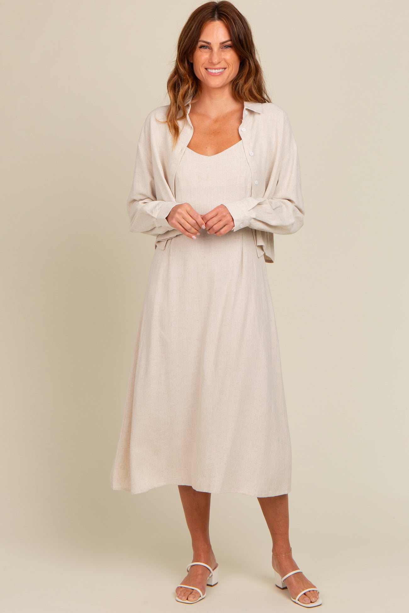 Beige Linen Cropped Shirt Midi Dress Set