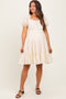 Beige Striped Front Tie Lace Trim Fitted Maternity Midi Dress
