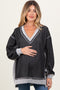 Elevate your casual wardrobe with our Black Contrast French Terry Long Sleeve Top. Crafted from soft, breathable French terry fabric, this relaxed-fit top features a flattering V-neckline and stylish contrast edging at the cuffs, hem, and neckline. The subtle two-tone design adds a modern touch to a classic silhouette, making it perfect for layering or wearing on its own. With dropped shoulders and a slightly oversized fit, it offers unbeatable comfort and effortless style for everyday wear. Pair it with jeans or leggings for a cozy yet chic look you'll love.