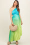 A dot print maternity plus size maxi dress featuring a v-neckline, a smocked bodice, short flutter sleeves, a ruffle hem and double lining.
