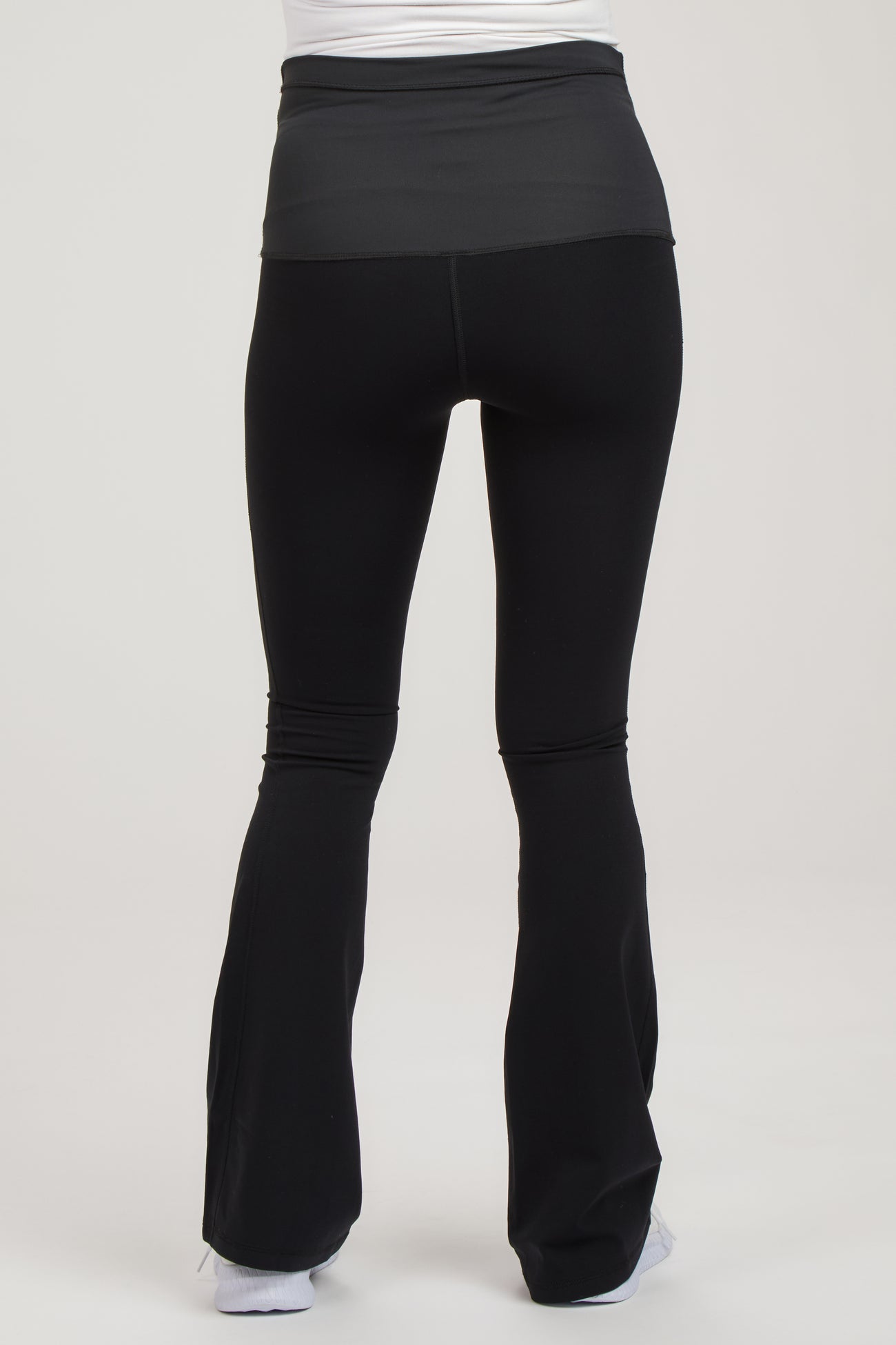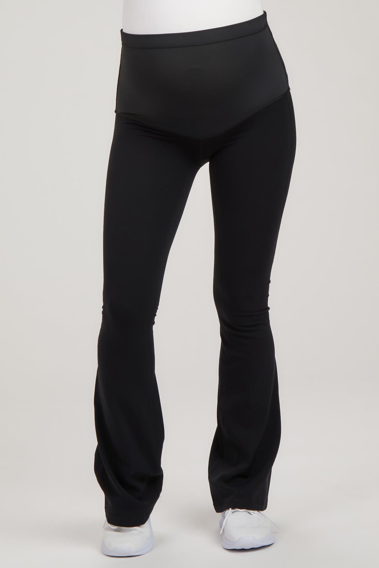 A pair of active maternity pants featuring an elastic belly band and flared pant legs.