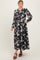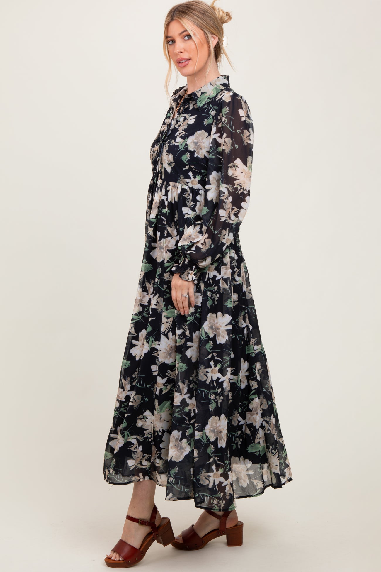 Black Floral Chiffon Ruffle Accent Button Down Maxi Dress