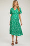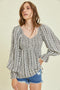A floral print maternity blouse featuring long sleeves and a smocked v-neckline.