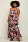 A floral print maxi dress featuring a square neckline, adjustable cami straps, a back zipper, a tiered skirt, and double lining.