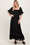 Black Leaf Print Smocked Shoulder Tie Tiered Maternity Maxi Dress
