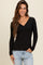 Elevate your wardrobe with this Black Ribbed V-Neck Long Sleeve Top, designed for effortless style and comfort. Crafted from soft, stretchy ribbed fabric, it contours to your shape while providing all-day comfort. The flattering V-neckline adds a touch of elegance, making it perfect for layering or wearing alone. Its versatile black color pairs seamlessly with jeans, skirts, or trousers for both casual and dressier looks. Whether you're heading to work or a weekend outing, this long sleeve top is a timeless essential that combines simplicity with chic sophistication.