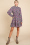 A solid velvet maternity plus dress with ruffle neckline, ruffle trim and button keyhole closure at back. Pocketed.