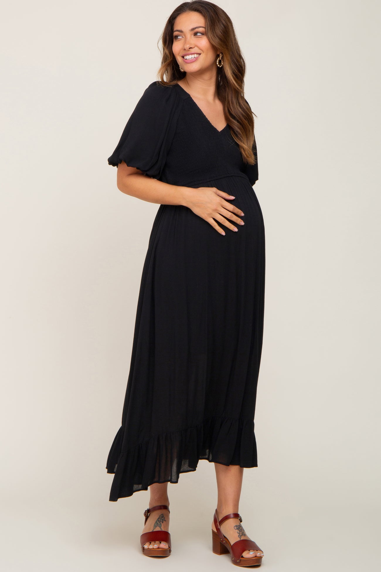 Black Smocked Puff Sleeve Maternity Midi Dress