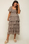 A maternity jumpsuit featuring a smocked top, a square neckline, short puff sleeves and a wide hem.