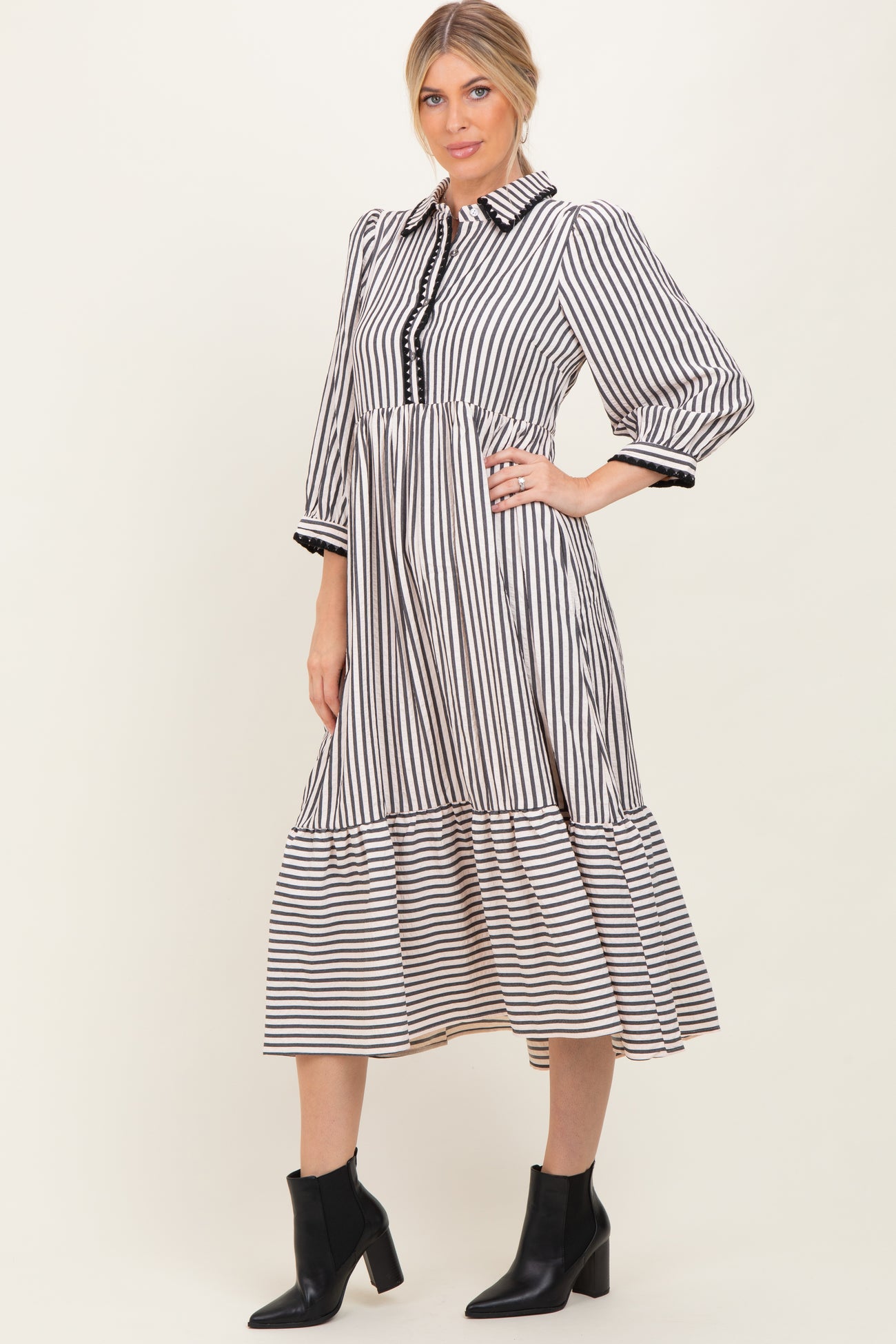 Black Striped Scallop Trim 3/4 Sleeve Midi Dress